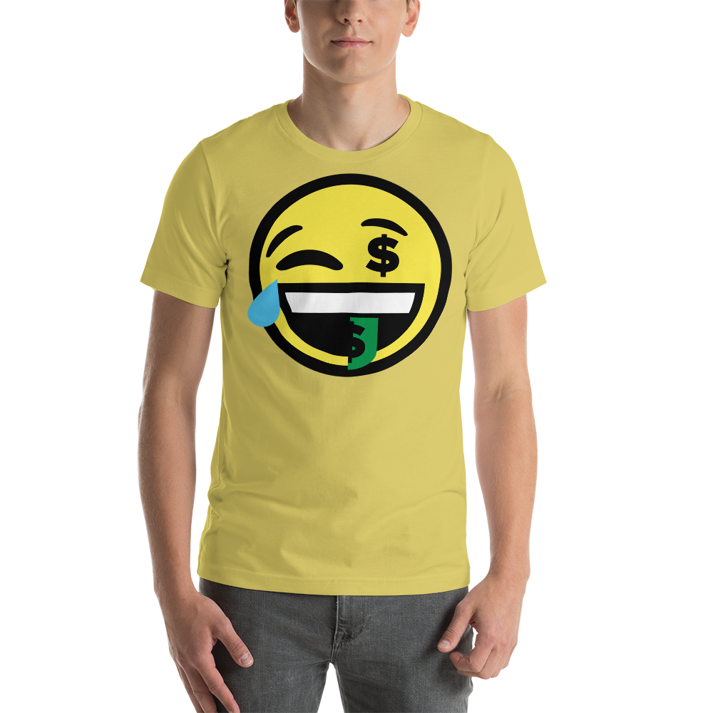 Laugh and save the day with the Dumojis® FUNDOE Short-Sleeve Unisex T-Shirt! This fun, comfortable t-shirt features laugh-tears emoji on one side and money mouths on the other. Put it all together, and you get FUNDOE – a pun for when laughter meets money. And that’s just what we should all be doing: having a little fun while making some money.